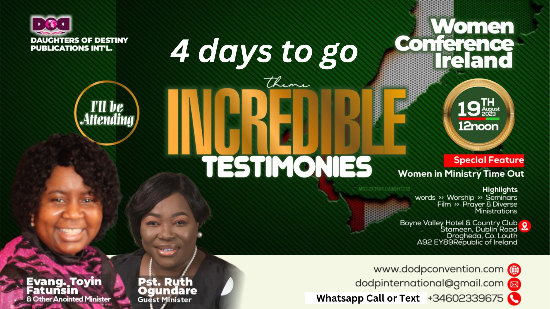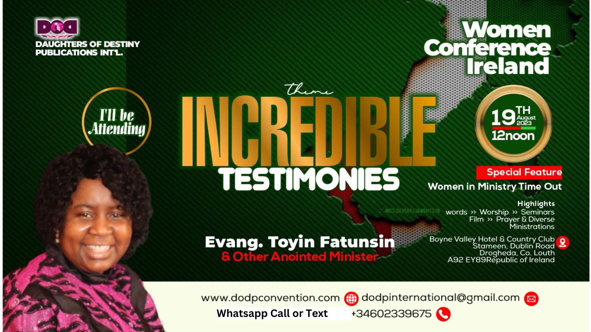 "It is not possible, it's unbelievable in this Europe" She said it out before realizing it but the truth remain the Lord did what was testified in the same Europe that by human standard it is impossible. That is what I call INCREDIBLE TESTIMONY. God is still in the business today of giving testimonies that leaves one's mouth opened. This is what the Lord will be doing in at Boyne Valley Hotel, Dublin Road, A92 EY89 Drogheda Ireland (25 minutes drive from Dublin) on Saturday 19th August 2023 by 12noon with the theme INCREDIBLE TESTIMONIES. The Lord will definitely give incredible testimonies to his daughters in Jesus name. Children are welcome to attend with their mothers.