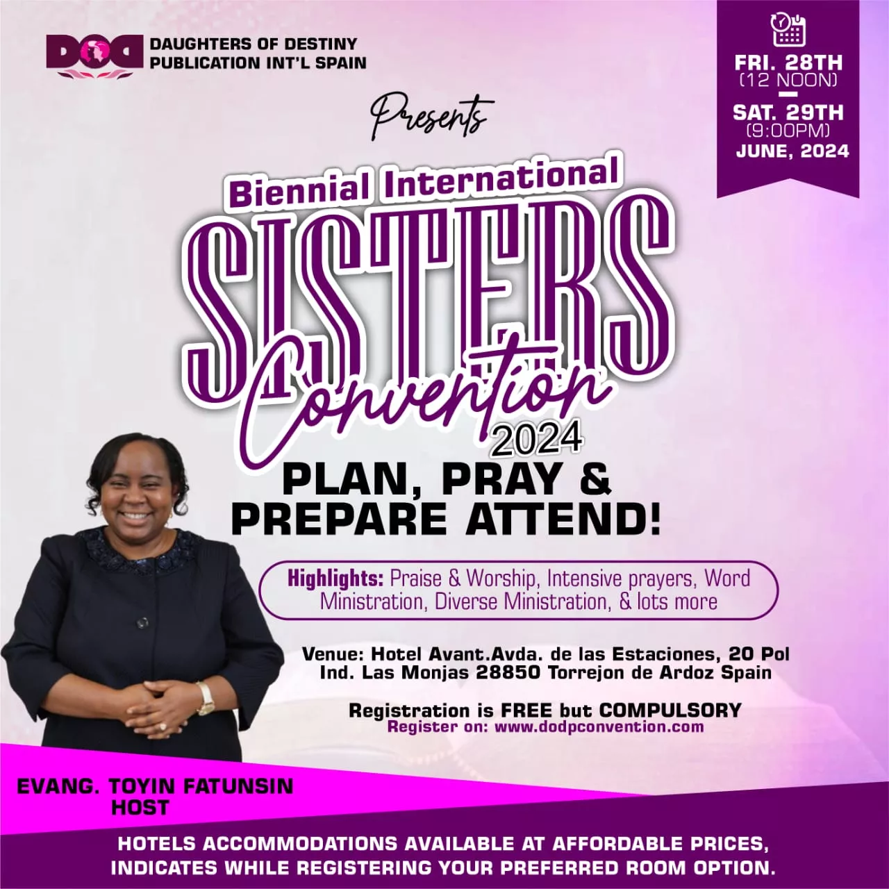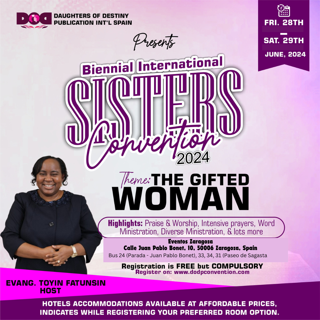 After a series of time out programme in various European countries by organized for members of the Daughters of Destiny Publications Facebook group and Online Fellowship and for women in general of; the Lord inspired Evangelist Toyin Fatunsin, host and founder of the ministry to start a biennial convention in 2014 to empower, liberate and inspire God's daughters from all over the world.